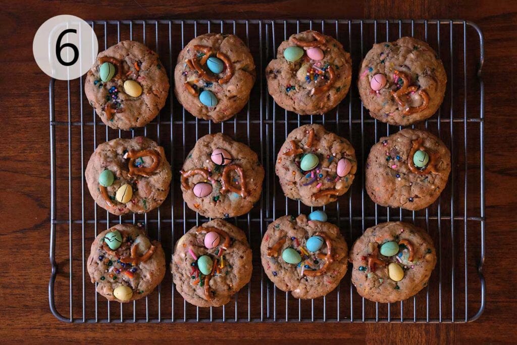 - Portion: Divide the dough into 16 portions, about 3 tablespoons each. Place the dough balls 2–3 inches apart on the prepared baking sheets. Press each ball down slightly and top with reserved Mini Eggs and pretzels. Ensure that you press down the toppings slightly so they stick.