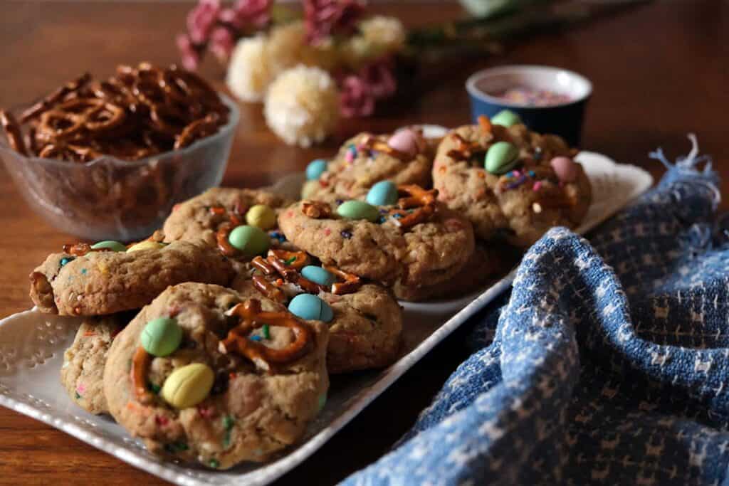 During the Easter season, a bag of delicious Cadbury Mini Eggs never lasts long enough. They are easily my favorite Easter candy. I knew I wanted to turn them into delicious cookies, but I also wanted to add a salty element and plenty of texture. Easter desserts often default to simple sugar cookies, and this holiday deserves better. I wanted a cookie with a little more excitement, something with salty pretzels, chewy oats, and plenty of texture to make those Cadbury Mini Eggs really shine.